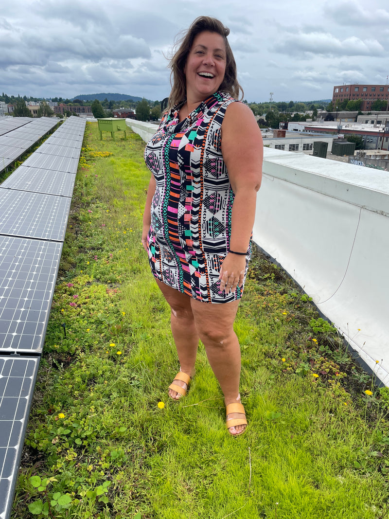 When both the cute models you use are named Heather then of course you have to name the dress the Heather dress! She's a badass body-con dress, but make it super cozy and comfy! It's our cowl neck body-con dress made from the softest, stretchiest knits! Currently available in Black, Cherry Red and this very fun bold print! We are now offering this cutie in a long and short option because some of you have said you want a short one to be able to really get down on the dance floor in!